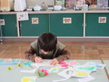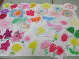 こどもたちは、それぞれ思い思いに色とりどりのお花を描き、のびのびと表現を楽しんでいました。一人一人の作品が集まると、紙面いっぱいに広がるすてきな花畑が完成し、笑顔と達成感があふれる時間となりました。